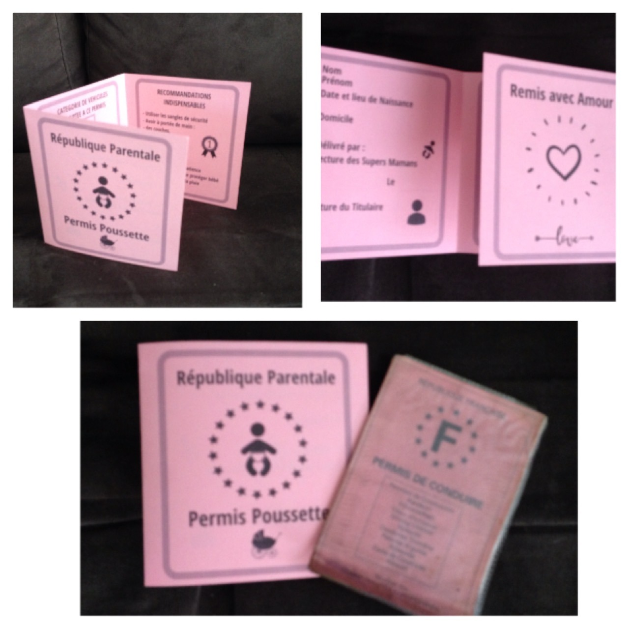 Donc l’idée c’est de mettre à la fois des choses utiles (boules quies…), des choses futiles ( La carte spéciale permis de poussette) et des petites tendresses. (J’adore ce mot « tendresse », ça sonne tout doux non?  😆 )
